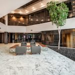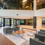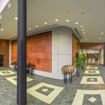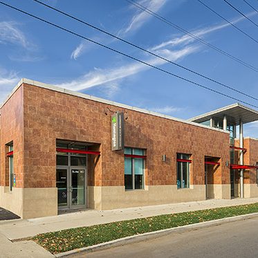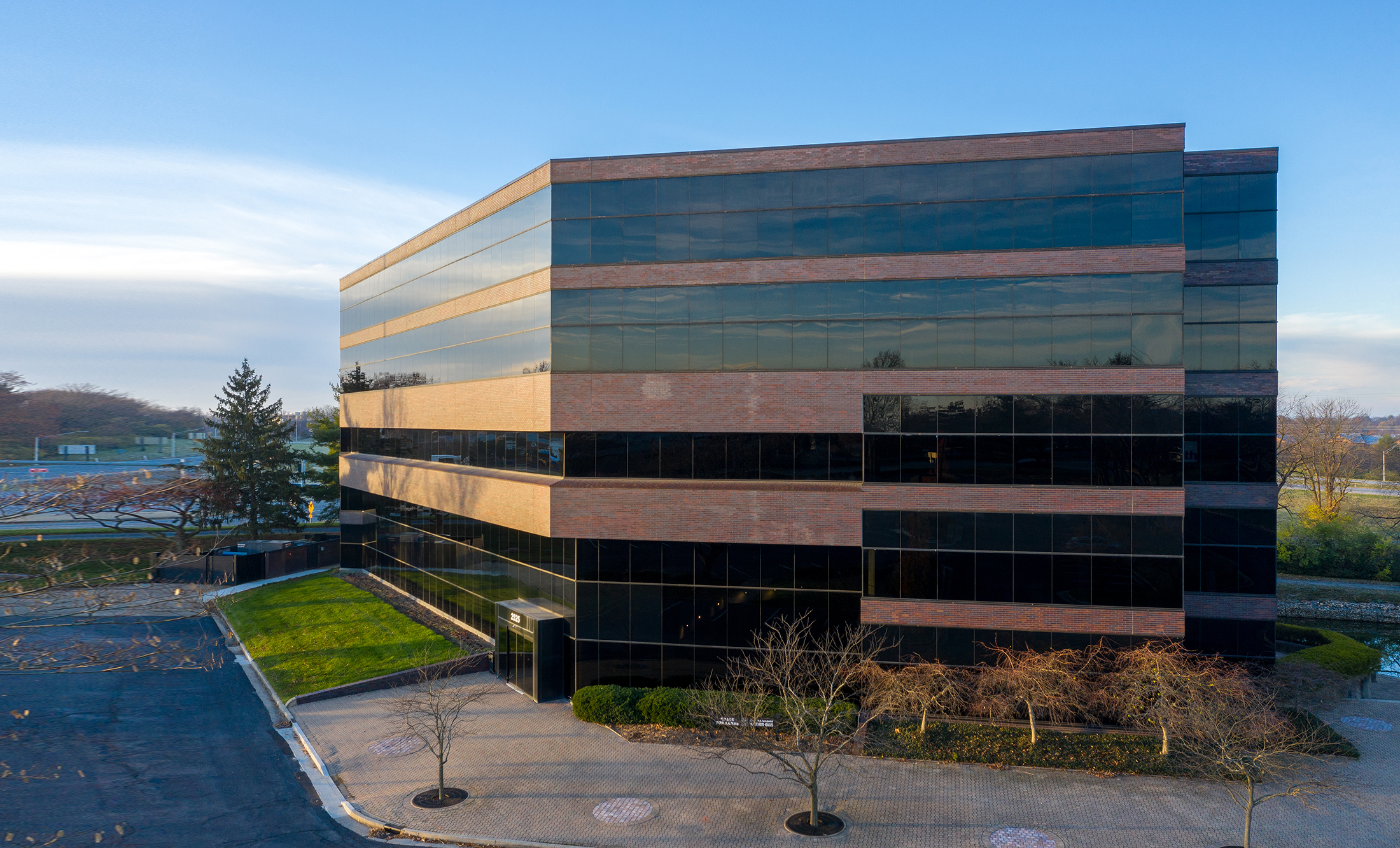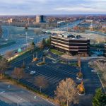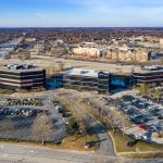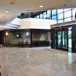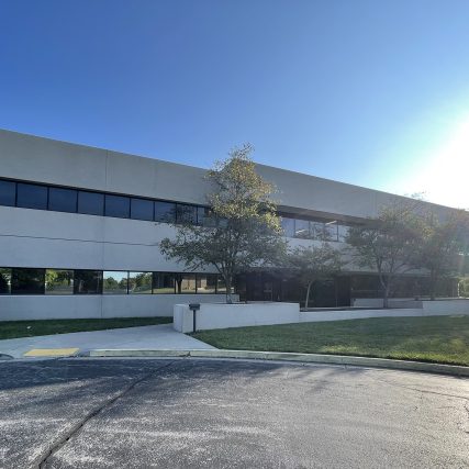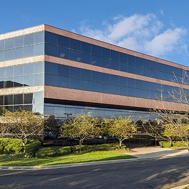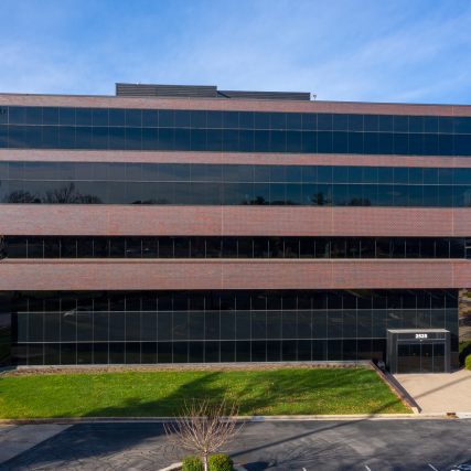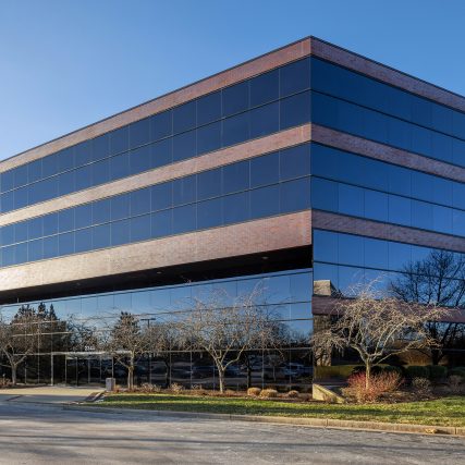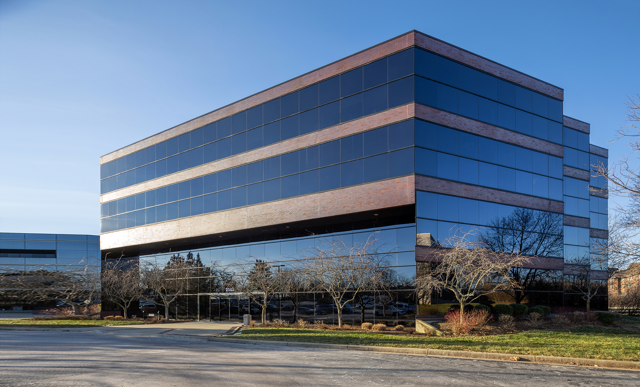 The contemporary glass and brick exteriors office building is located at the intersection of Harrodsburg Road (US 68) and New Circle Road.